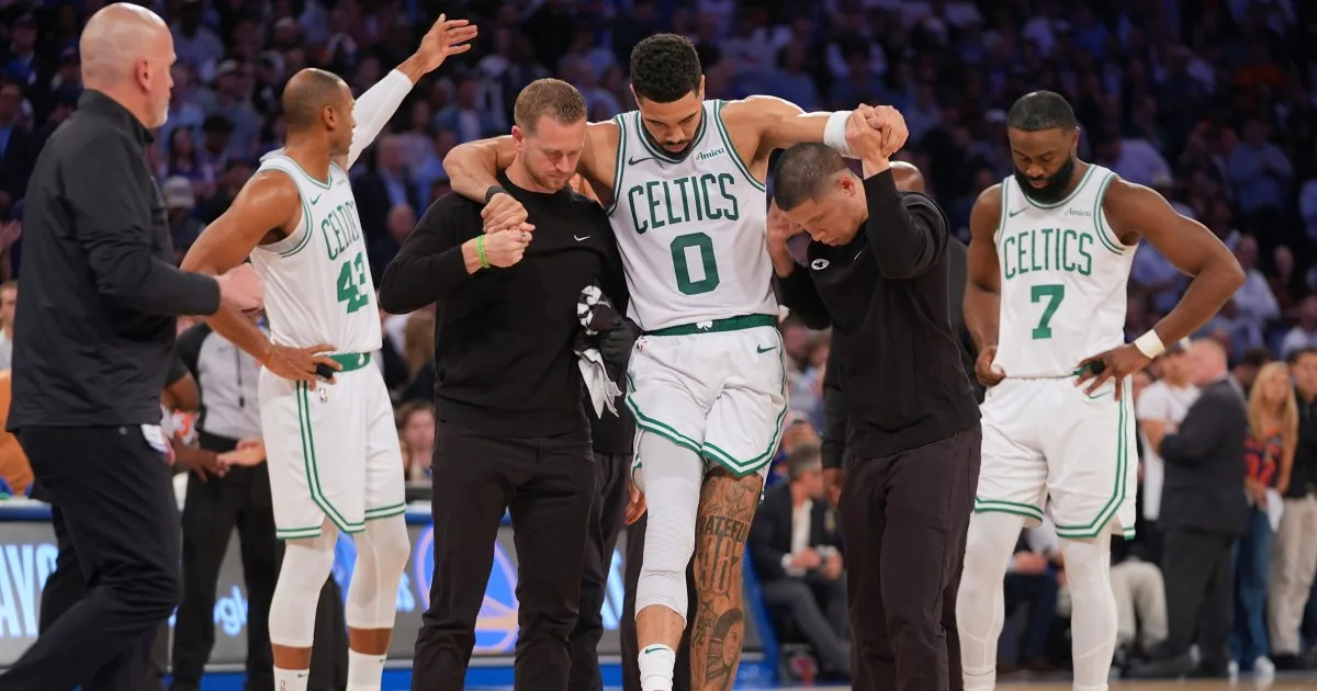 Celtics superstar Jayson Tatum suffered an apparent right leg injury late in the fourth quarter Monday night as Boston went down 3-1 in the series against the New York Knicks.