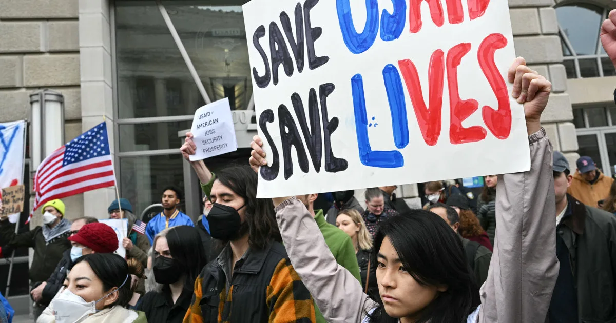 People protest outside of the headquarters for United States Agency for International Development (USAID), in Washington, DC, on Monday.Mandel Ngan / AFP – Getty Images